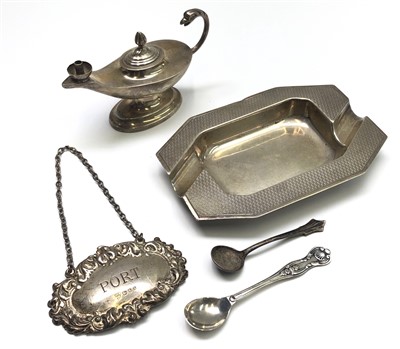 Lot 2192 - A small silver wick lamp, an engine turn...