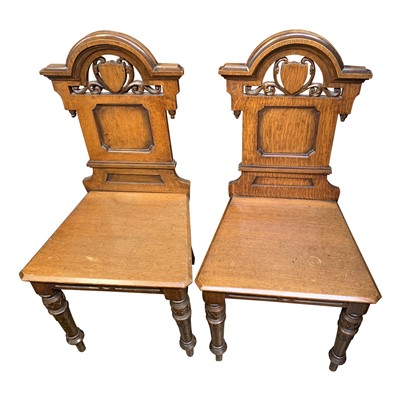 Lot 3481 - A pair of oak hall chairs with scroll and...