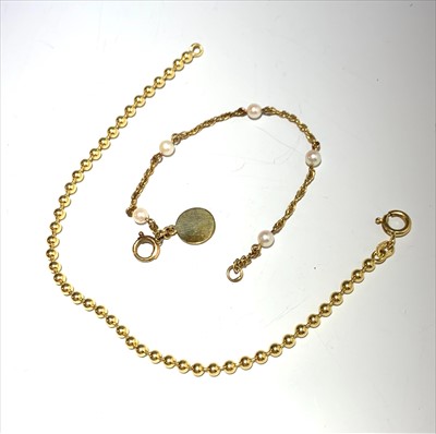 Lot 2674 - A 9ct. gold chain bracelet with spaced pearls...