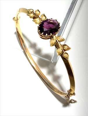 Lot 2635 - 15ct Gold bangle with amethyst and pearls