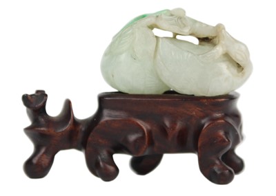 Lot 526 - A Chinese carved jade goose turned to grasp lotus, Qing Dynasty, 19th century.