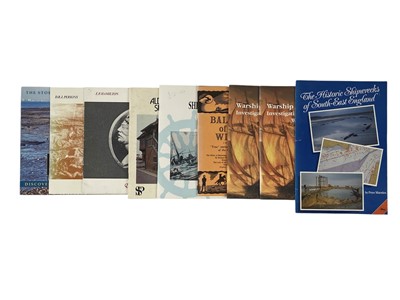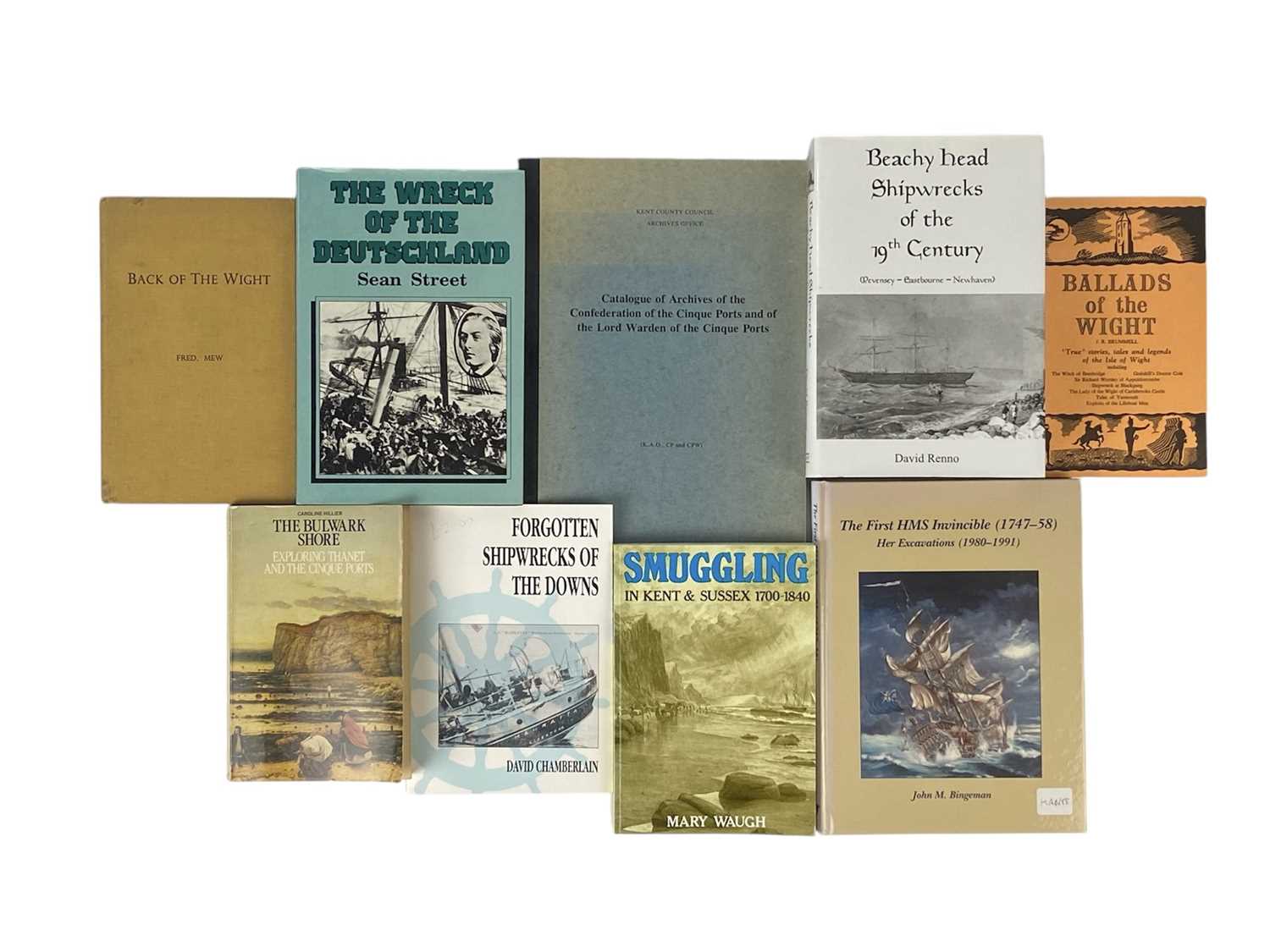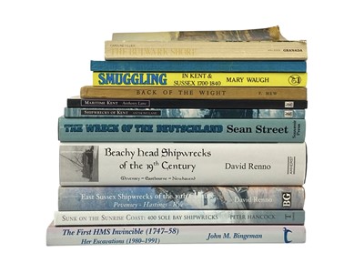Catalogue of the Archives of the Confederation of the Cinque Ports and of the Lord Warden of the Cinque Ports = Kent Council Archives Office revised edition 1979. 2nd edn (no date). Kent: Kent Archives Office; Renno, D. (2004) Beachy Head Shipwrecks of the 19th century: (Pevensey - Eastbourne - Newhaven). Sevenoaks: Amherst; Renno, D. (2002) East Sussex Shipwrecks of the 19th century: (Pevensey, Hastings, Rye). Lewes: Book Guild; Street, S. (1992) The wreck of the Deutschland. 1. publ. London: Souvenir Press; Bingeman, J.M. (ed.) (2010) The First HMS Invincible: 1747 - 58), Her excavations (1980 - 1991. Oxford: Oxbow Books; Mew, Fred. (1962) Back of the Wight. Reprinted with Further Additions. IOW, the County Press; Waugh, M. (2003) Smuggling in Kent and Sussex 1700-1840. Revised and updated 2003. Newbury: Countryside Books; Chamberlain, David (1993) Forgotten Shipwrecks of the Downs, Kent. Deal, Kent: David Chamberlain; Perkins, D.R.J. (no date) The Great Storm Wrecks - on the Goodwin Sands, Kent. Ramsgate, Kent: East Kent Maritime Trust; Hamilton, E.P. (no date) The Wreck of the Indian Chief - on the Long Sand, Thames estuary. Ramsgate: East Kent Maritime Trust; Holland, Sarah + (1982) Warship HMS Hazardous - investigating a Protected Wreck. Southampton: Hampshire & Wight Trust; Lane, A. (1999) Shipwrecks of Kent. Stroud: Tempus; Carpenter, E. (1985) Wrecks and Rescues off the Romney Marsh Coast. Lydd: Margaret F. Bird and Associates; Brummell, J.R. (no date) Ballards of the Wight (1 vol). Ryde, Isle of Wight: Lightbowns Ltd, Ryde; Hancock, Peter. (2008) Sunk on the Sunrise Coast. 400 Sole Bay Shipwrecks. Stroud. The History Press; Lane, A. (2000) Maritime Kent. Stroud: Tempus, Stroud, Glouc; Marsden, P. (1987) The Historic Shipwrecks of South-East England. 1st edn. Norwich: & Son Ltd, Norwich; Four copies of Volume 2-Section 5 of the Larn's 'Shipwreck Index of the British Isles....Kent (Downs). (24)