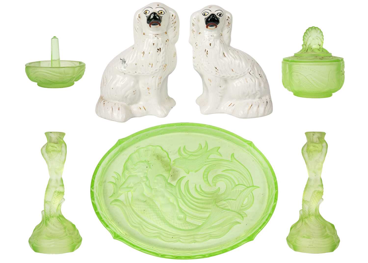 Comprising a pair of mermaid candlesticks, an oval tray with mermaid, fish and shell moulded decoration, a pot and cover and a ring stand, the tray width 35cm, together with a pair of Staffordshire spaniels.