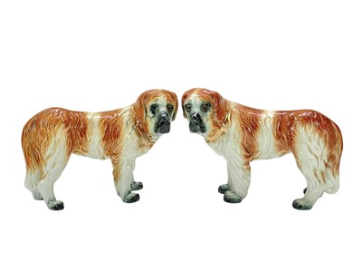 Lot 363 - A pair of Staffordshire pottery figures of St Bernard dogs.