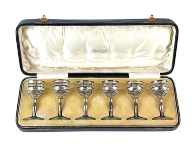 Lot 371 - A cased set of six silver overlay liquor glasses.