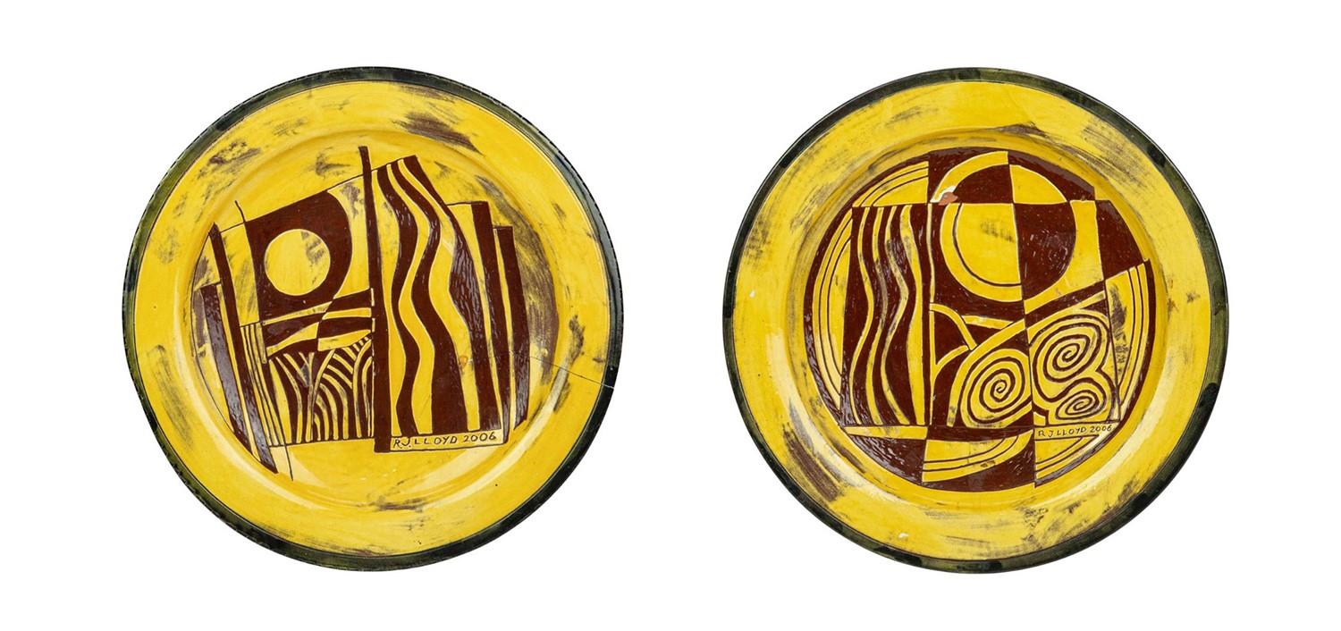 As well as screen printing and stained glass, pottery was an important discipline to Reg Lloyd and he threw, decorated and fired his own work. In addition to making his own, he collected English slipware. He put together an exceptional collection that was purchased in 2009 by the Burton Art Gallery in Bideford.